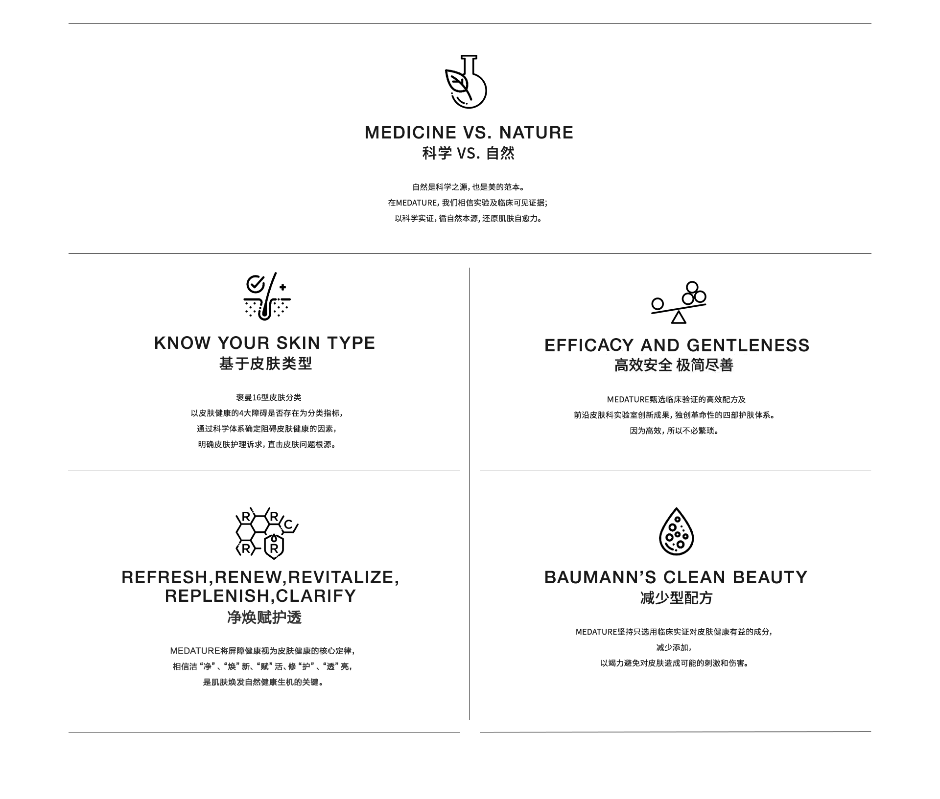 MEDATURE甄选临床验证的高效配方及前沿皮肤科实验室创新成果,独创革命性的四部护肤体系。因为高效,所以不必繁琐。